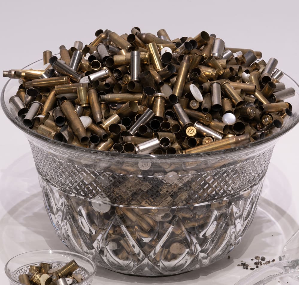 Loss. Redemption. Grace / Talking Back I Buttons & Bullets Detail I 9.75”h x 51”w x 18.5”d I 4,000 bullet shells, buttons, and aluminum scooper, wooden bowl