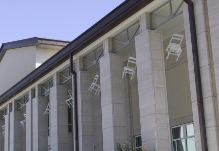 National Juried Exhibition, Emory Chairs Project. Wooden chairs suspended in the colonnade of the Schwartz Center for Performing Arts. | Emory University, Atlanta GA | 2003