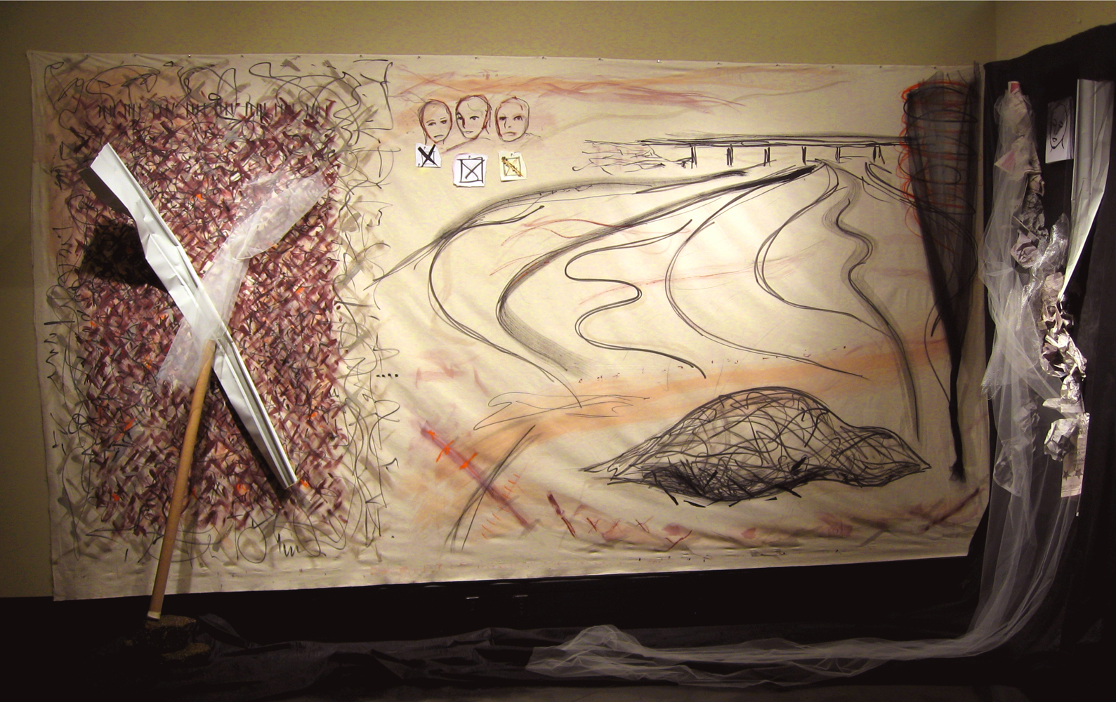 Mixed media on muslin, with gutters, newsprint and fabric. 9'h x 16.5'w x 5'd | Solo exhibit of "X.U.ME" at the Alexandria Museum of Art | Alexandria, Louisiana | 2008
