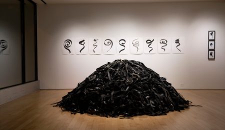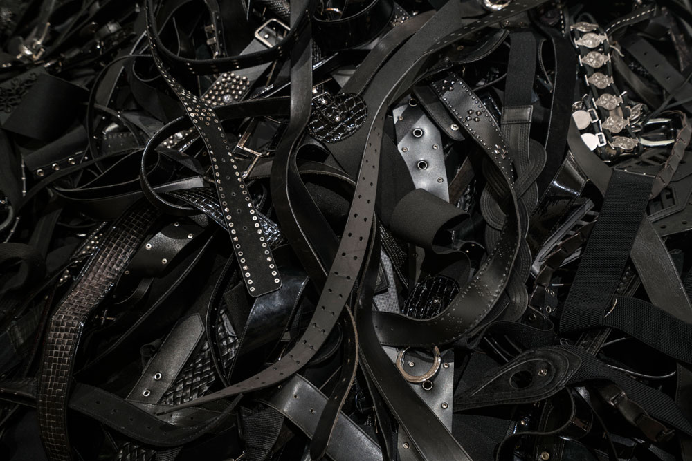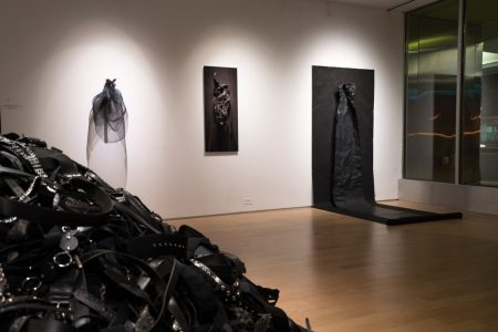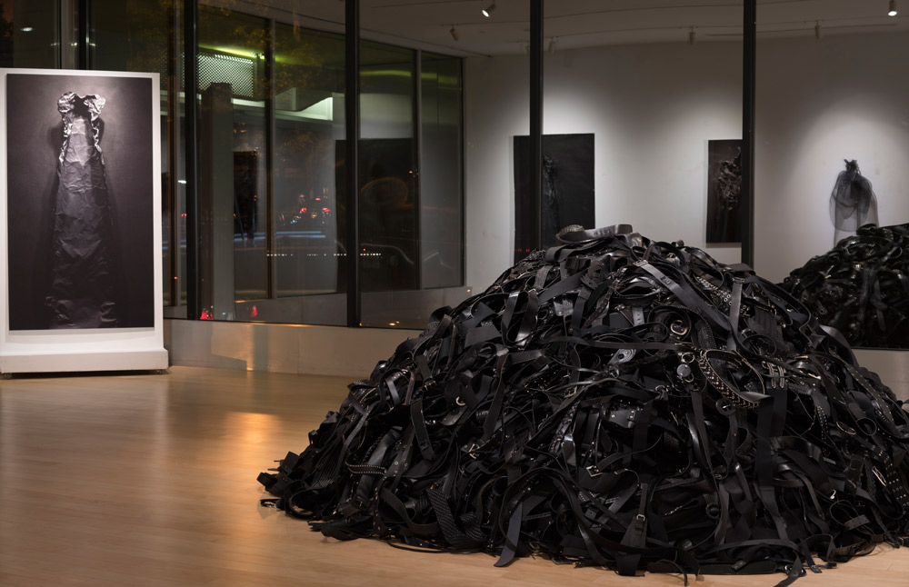 South Gallery installation view includes “Pit” – previously owned black belts over armature, 11' diameter x 56”h, 2012 – 2018, and "Shed 10” photographically printed on gatorboard, 76"h x 42.5”w, 2016 | 2018