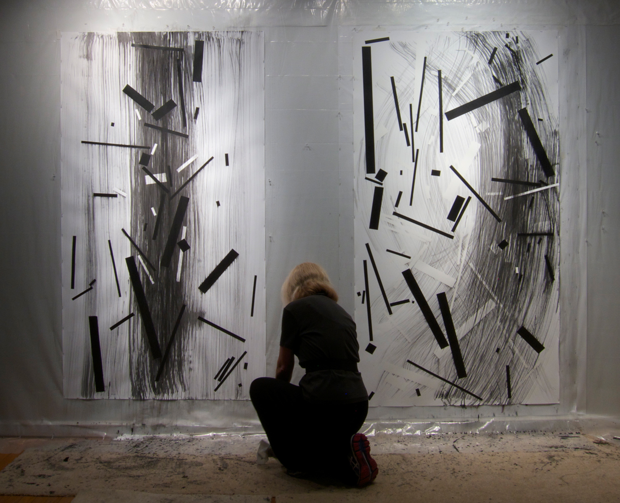 Studio view of works on paper. Left: "The Space Between Us, No. 12". Right: "The Space Between Us, No. 11"